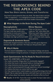 The Neuroscience Behind The Apex Code How Your Brain Learns, Grows, and Transforms Your brain is more powerful than you think. The Apex Code is not just a film or experience - it is designed to activate your brain’s highest potential using proven tools from modern neuroscience. What Happens in the Brain During The Apex Code? Neuroplasticity Your brain changes through experience. The Apex Code uses sound, story, and emotion to rewire your thinking, helping you let go of old patterns and adopt new, high-performance beliefs. Mirror Neurons These are the brain cells that make you “feel” what others feel. When you watch Apex creators act with confidence, leadership, and vision - your brain starts copying those patterns. Dopamine & Serotonin Boosts Emotionally charged moments in the story release feel-good chemicals. These make new ideas more memorable and more enjoyable to adopt. Heart-Brain Coherence Music, breath rhythms, and visuals create calm, focused alignment between your heart and brain. This helps you feel grounded, open, and fully present.