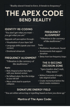 The Apex Code: Bend Reality "Reality doesn’t bend to force. It bends to frequency." Core Idea: "The Apex Code: Bend Reality" is a system of personal mastery and frequency elevation that teaches individuals to override old programming, step into their highest identity, and reshape the physical world through inner alignment, bold action, and quantum principles. Foundational Elements: 1. IDENTITY RE-CODING You don’t get what you want - you get what you are. Upgrade self-perception through: o Visualization of your Apex Self o Language shifts (speak your next version) o Emotional rehearsals 2. FREQUENCY ALIGNMENT Vibration is the currency of the multiverse. Tools: o Meditation, Breathwork, Sound o Environments that support elevation o Detox from low-frequency loops